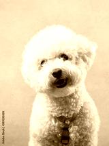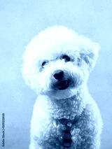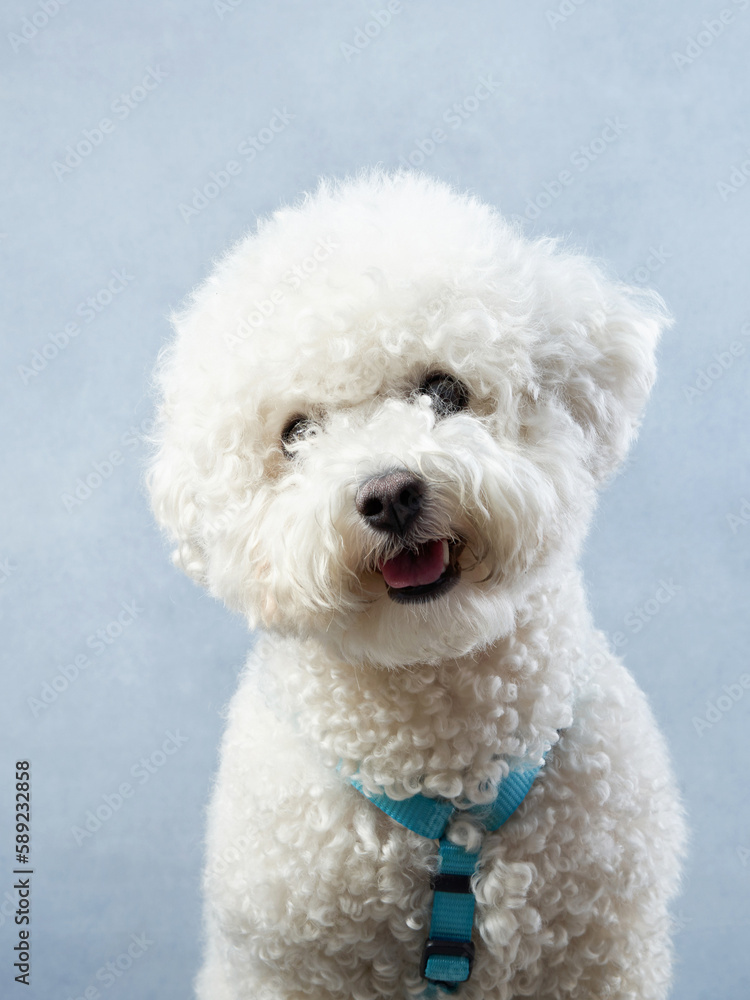 white poodle on a blue background. curly dog in photo studio. Maltese, poodle, maltipoo
