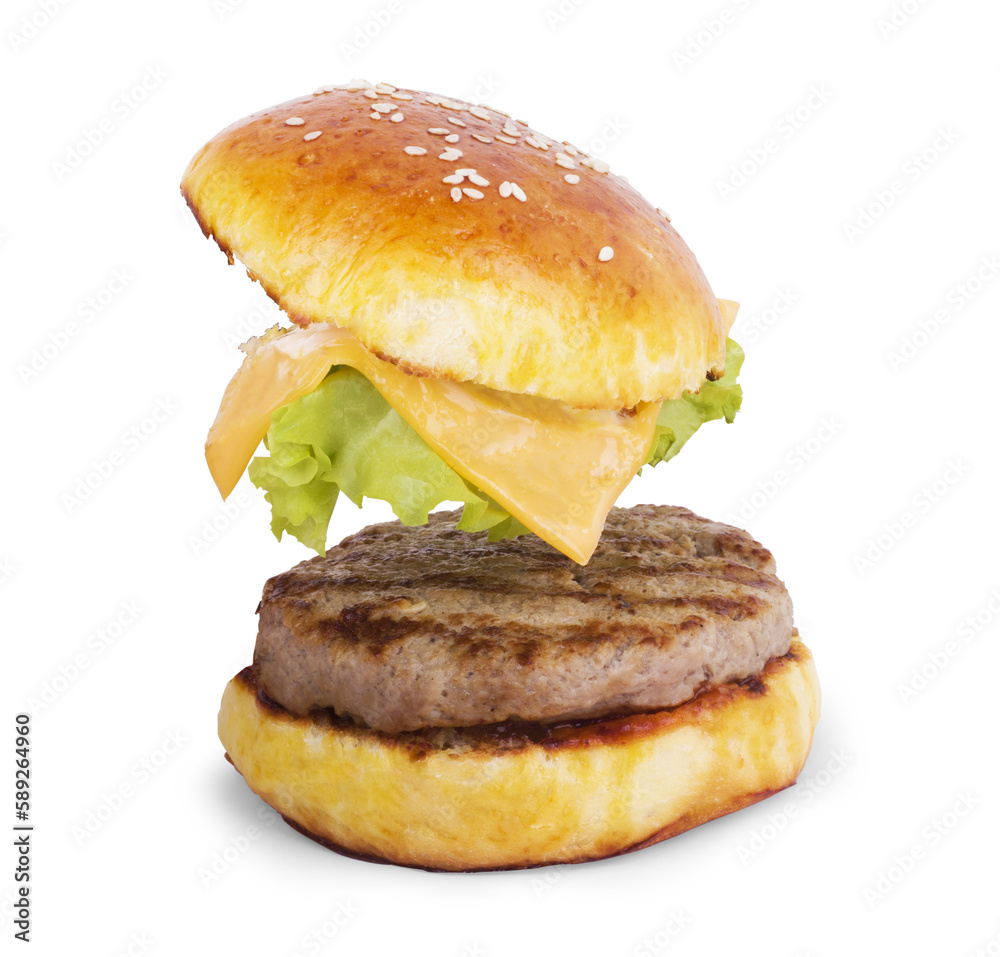 Close up of delicious meat burger with cheese, greenery and sesame isolated on black