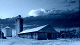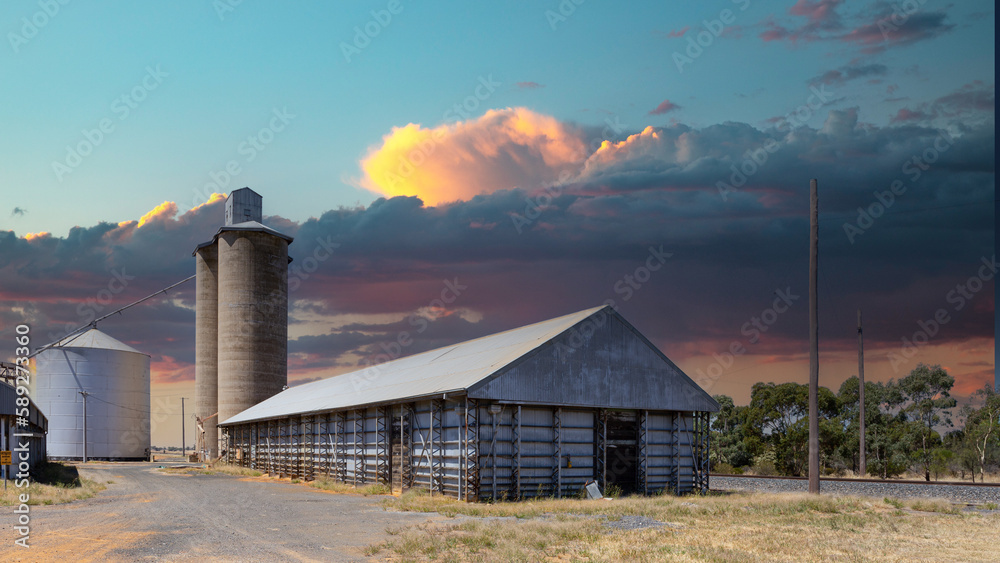 Scheune aus Wellblech und Getreidesilo im Abendrot