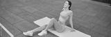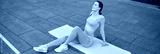 Beautiful fit caucasian woman is doing exercises outdoors at the city