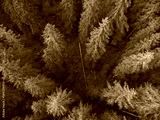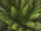 A long trunk of a dry tree lies between the fir trees in the forest, top view. Green spruce forest aerial photo. The deaf green taiga. Natural reserve.