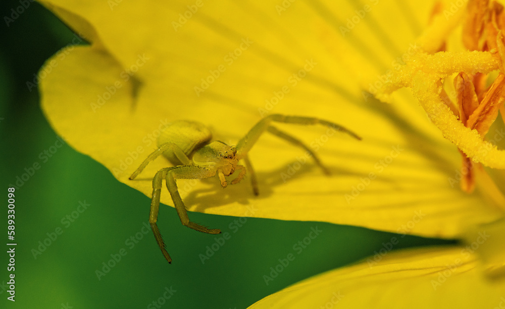 Macrophotography of a yellow flower spider in a flower.The spider spread its paws in anticipation of food.