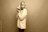 mature woman in a jacket received a gift for the holiday on a studio background with copy space