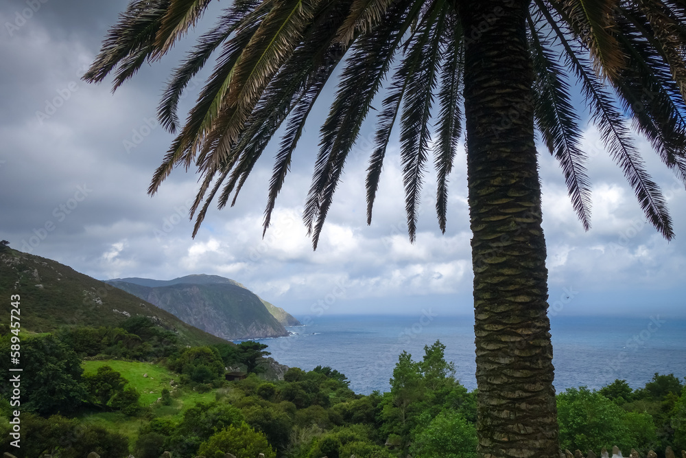Palm tree, Ocean and cliffs in Galicia, Spain