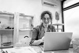 Female business owner using laptop in pottery studio workshop.