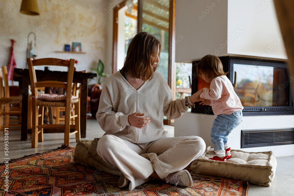 Happy young mother and toddler daughter spending time together on floor near fireplace at home. Cozy interior