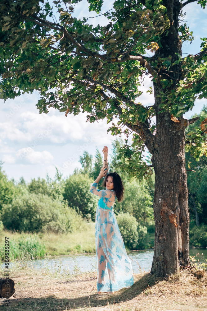 young girl with a sexy body in swimsuit and tunic poses on beach by river in summer