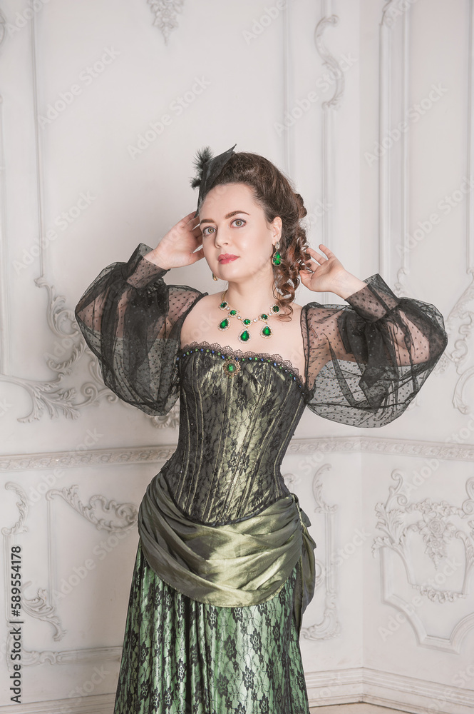 Portrait of Beautiful young woman wearing green medieval vintage Victorian Style dress
