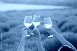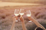 People holding glasses of wine making a toast at summer picnic on the lavender field. Friends toasting wine at a relaxed party.