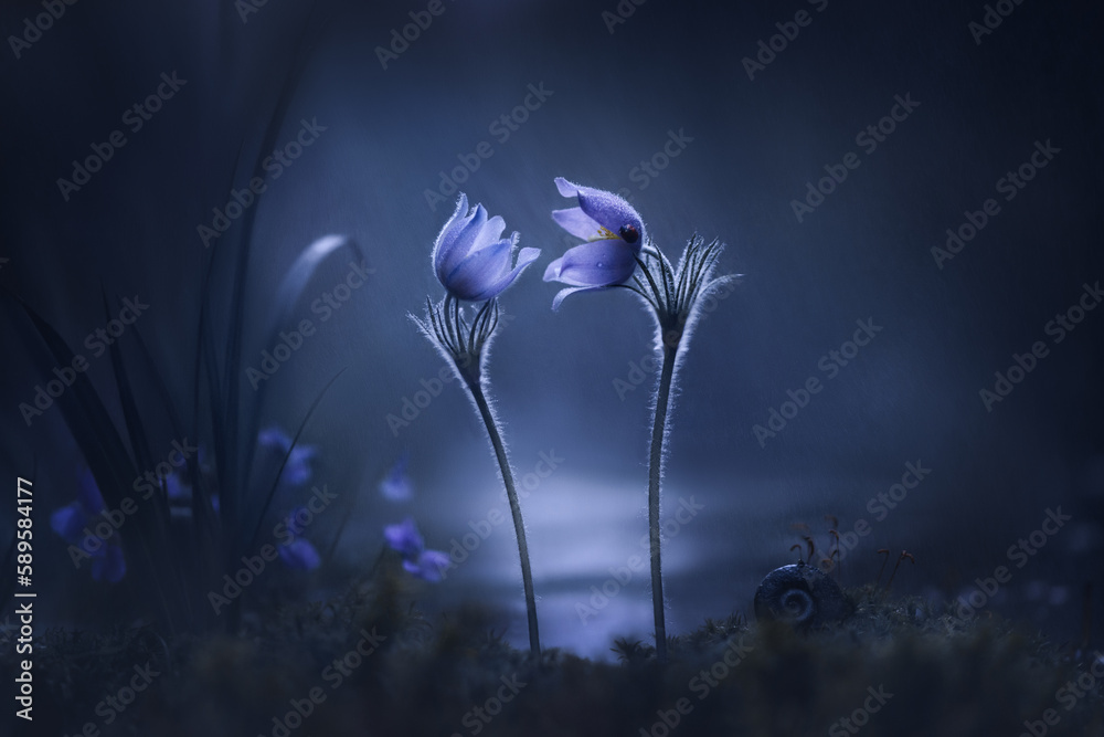 Anemone flowers (Pulsatilla patens) in spring outdoors in nature macro, soft focus. Atmospheric photo, gentle artistic image. Romantic image of love, spring flower, wallpaper, template for design