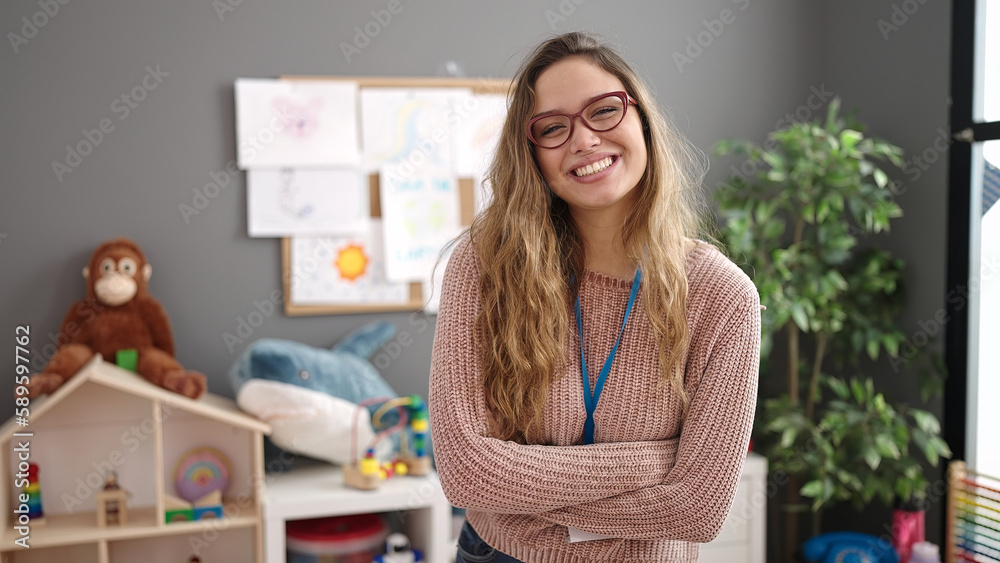 Young beautiful hispanic woman preschool teacher smiling confident standing with arms crossed gesture at kindergarten
