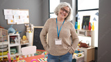 Middle age woman with grey hair preschool teacher smiling confident standing at kindergarten