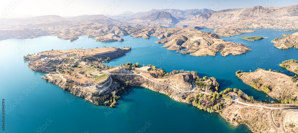 Looking down into the canyon, the lush greenery and glistening waterways create a tranquil oasis amidst the rugged terrain of the surrounding mountains.
