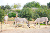 Somali wild ass, African wild ancestor of the domestic donkeys, endangered and rare in nature and in captivity. Equus asinus somalicus, animals are feeding in Attica Zoo enclosure. Athens, Greece.