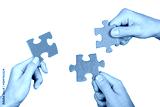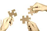 Teamwork, cooperation and partnership concept, human hands holding puzzle pieces