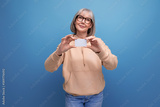 60s granny woman with gray hair who masters cashless payments by credit card on a studio background with copy space