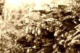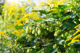 Hop cones grow on the stem of the plant, green foliage, nature background