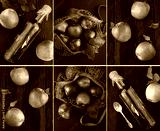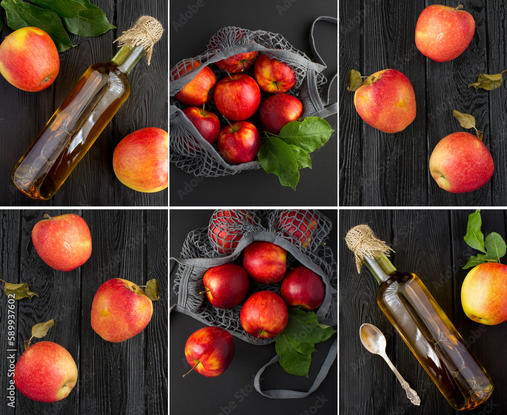 Collage. Apple cider vinegar in the glass bottle and apples on the balck background. Top view. Close-up.