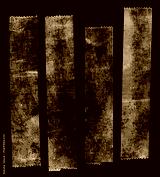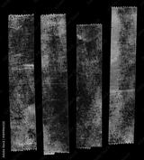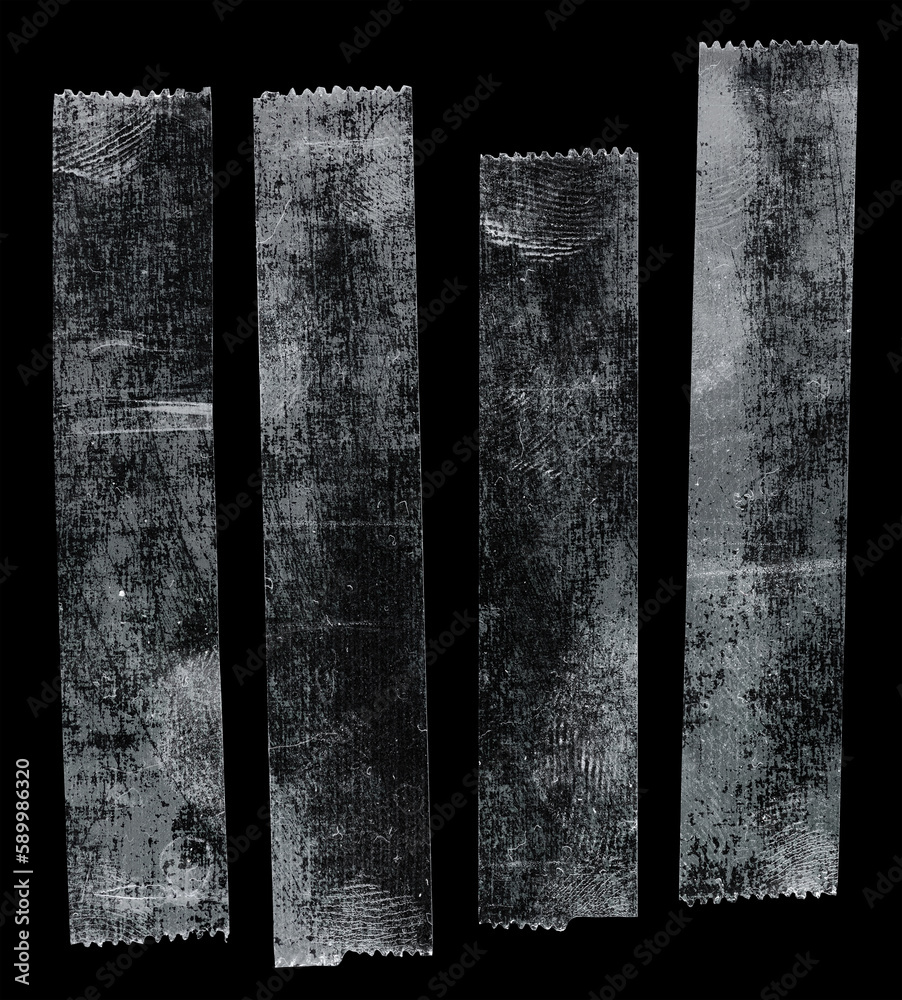 set of transparent adhesive tape or strips isolated on black background with nice light reflection, crumpled plastic sticky snips, poster design overlays or elements.