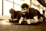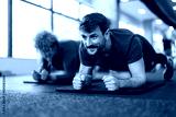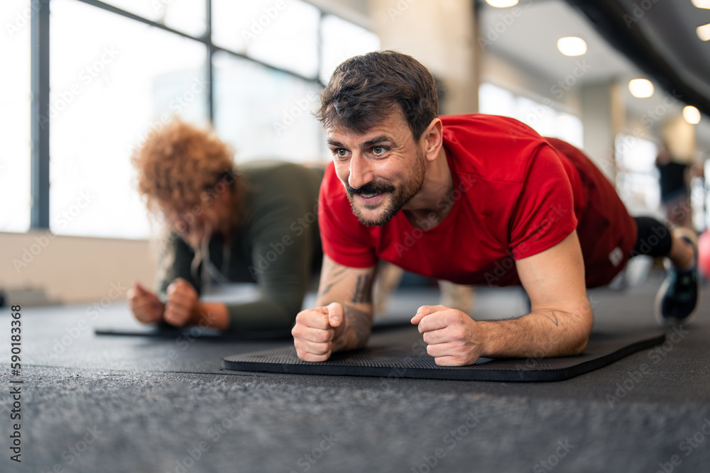 Focused young motivated sports man fitness professional coach doing plank session exercises for stronger core abdominal muscles in gym on yoga mat with young woman gym client who is out of focus.