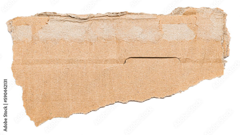 Isolated single piece of crumpled ripped blank brown cardboard paper, top view from above on white or transparent background