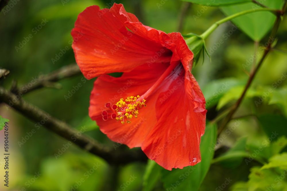Shoe black plant with a natural background. Also called Hibiscus rosa Sinensis, Chinese hibiscus, China rose, Hawaiian hibiscus, rose mallow and shoeblack plant