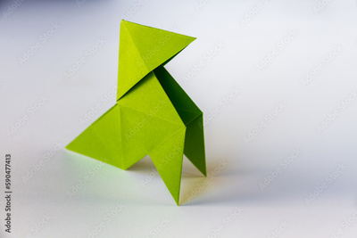 Green paper hen origami isolated on a white background
