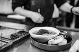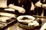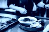 close up of male chef hand serving plate of soup at restaurant kitchen