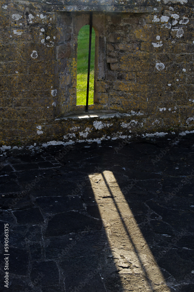 evening sun shining through a ruin window in an old abbey in Ireland