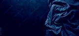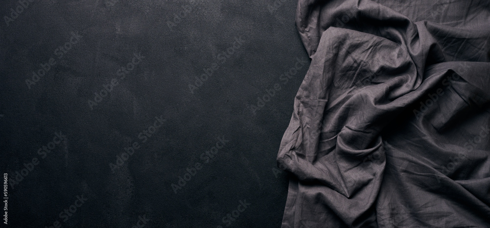 Folded black linen linen kitchen towel on a black background, top view. Copy space