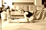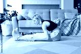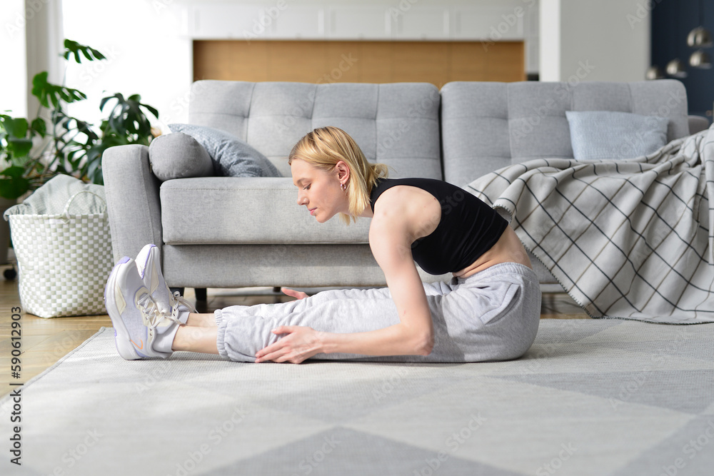 Woman doing stretching exercise at home.