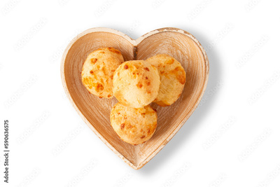 Cheese bread (Brazilian pao de queijo mineiro), top view, transparent png background, heart shaped plate