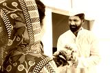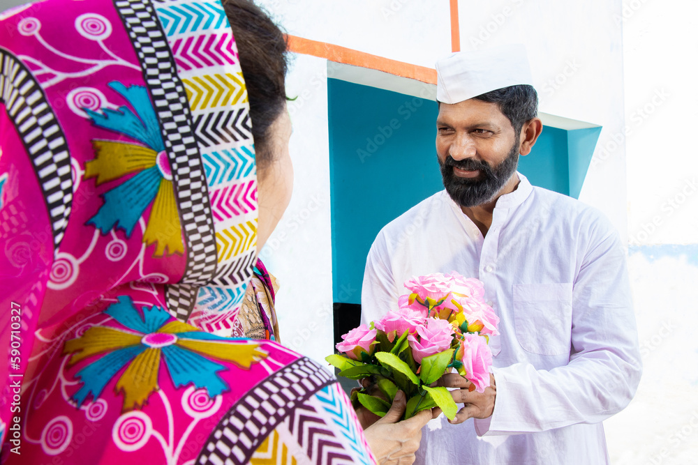 Indian man politician receive bouquet of flower by woman wearing sari. Concept of political leader welcome. Concept of election and vote