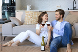 Happy couple sitting, relaxing on floor in living room, drinking red wine. Smiling young husband and wife rest at home enjoy romantic date on family weekend together