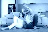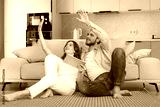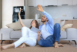 Happy couple sitting and planning new home decoration at home with a tablet, renovation and interior design for new house