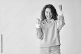 Young happy lucky overjoyed woman model student feeling excited winner raising fists in yes gesture celebrating great crazy win, rejoicing victory feeling joy standing isolated at white background.