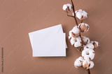 Cotton branch with empty blank paper sheet card top view. Minimal composition from natural cotton flowers for design, blogging or branding in flat lay style.