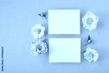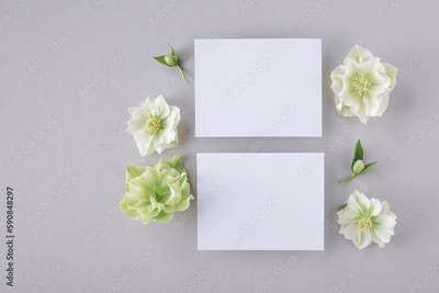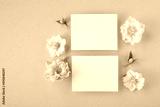 Invitation card mockup with empty paper blank decorated natural flowers top view. Minimal aesthetic template.