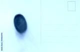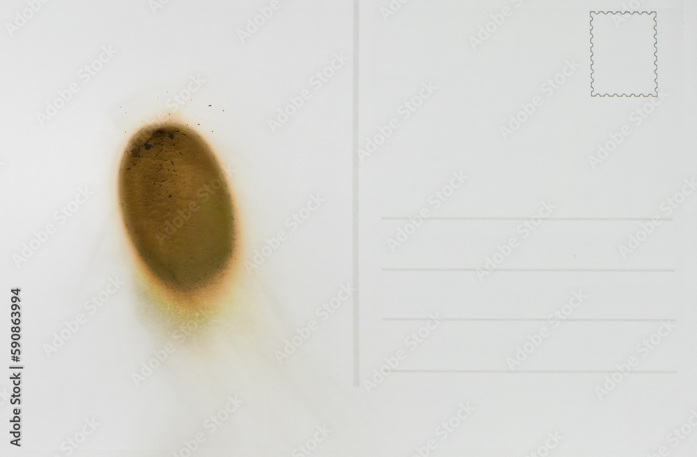 backside of postcard with small burning spot in the middle of the surface. top view of charred paper.