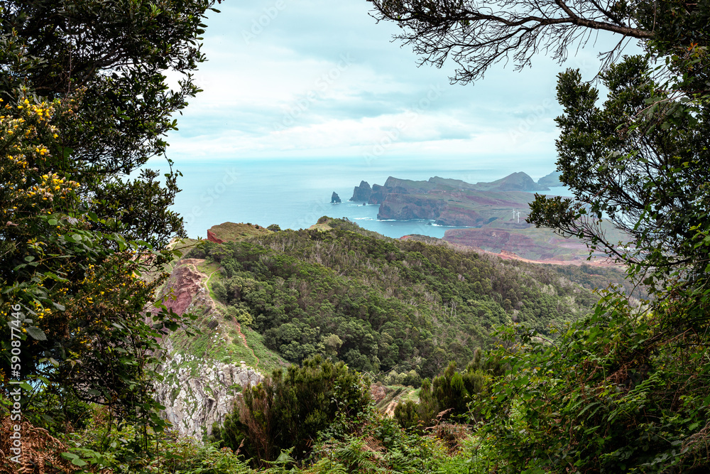 Madeira. Hiking trail Vereda Boca do Risco. Steep Cliffs over the Atlantic Ocean. Near Machico and Canical. Madeira Island, Portugal.