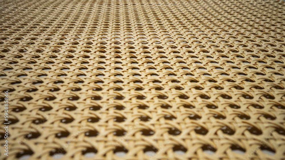 Photo of the texture of a woven yellow background made of reeds.Weaving on summer furniture. Rattan furniture.