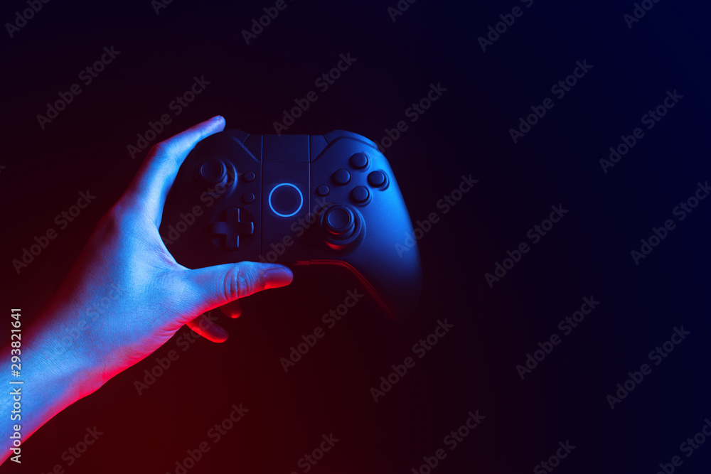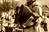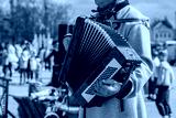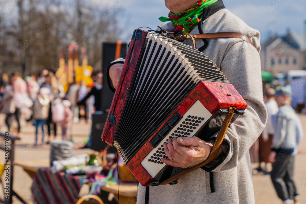 Gentleman musician plays a red accordion at a traditional Baltic cultural event wearing traditional wool outfit un grey color