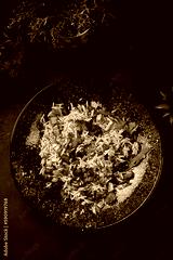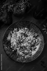 Pilaf with with lamb, raisins, almonds, carrots, tomatoes, onions and herbs on dark background.