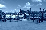 Salisbury, Wiltshire, England, UK. 2023. People walk on Market Place in the city centre surrounded with historic buildings, shops and offices.