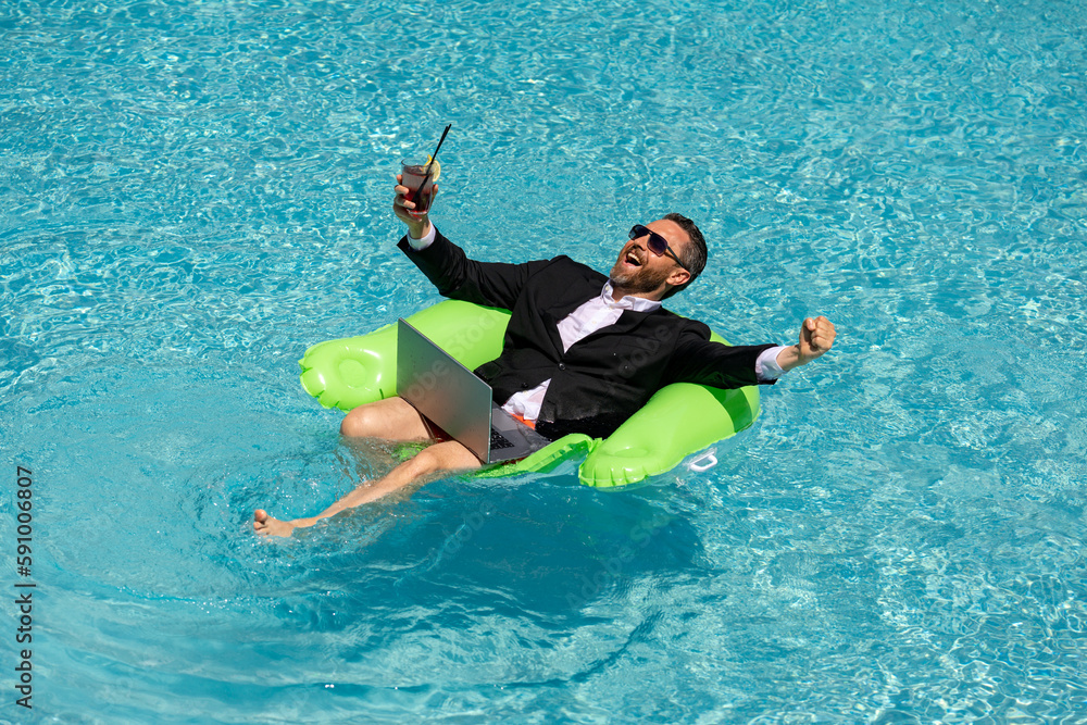 Excited business man floating in suit drink summer cocktail and using laptop in pool. Travel business. Office employee using laptop in pool on summer day. Successful businessman dreams in summer pool.