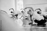 Happy elementary student and her classmates having PE class at school gymnasium.