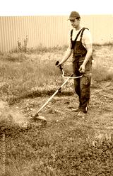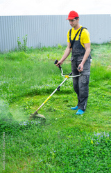 A male gardener mows the green grass of the lawn in the backyard with a gasoline mower. Trimmer for the care of a garden plot