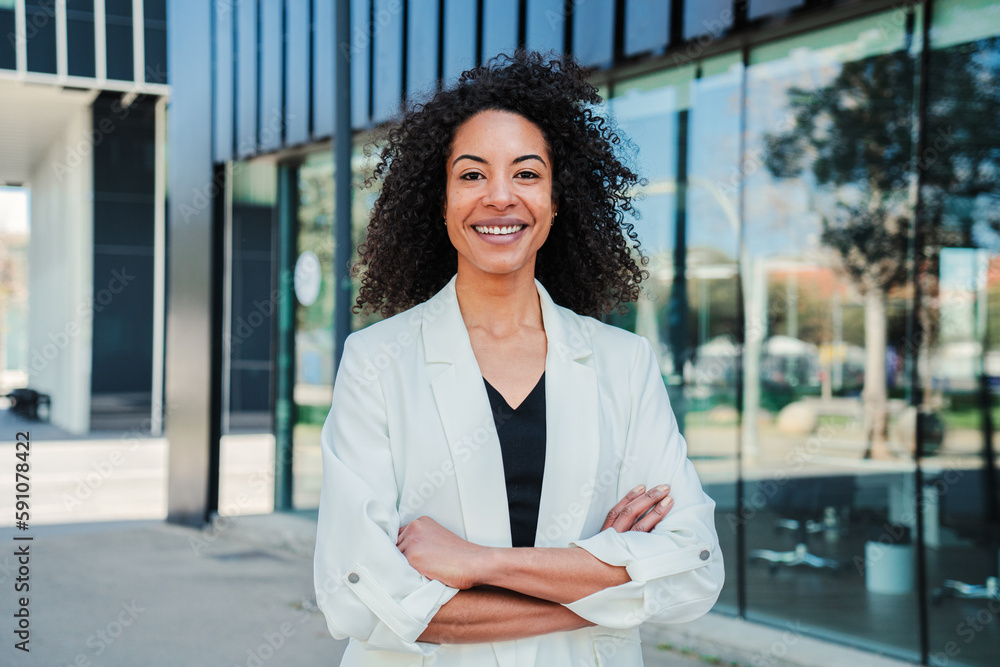 Hispanic arms crossed business woman with curly hair smiling looking at camera and standing at workspace wearing a executive suit. Portrait of folded corporate employee lady with successful attitude