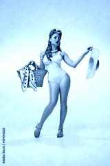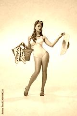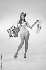 Beach season, summer vacation. Sexy, beautful young girl in stylish swimming suit and straw bag posing against grey background. Concept of retro fashion, beauty, 50s, 60s. Pin-up style