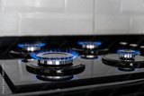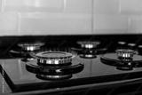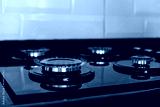 The gas burns in the burner of a kitchen stove. Industrial resources and economy concept.